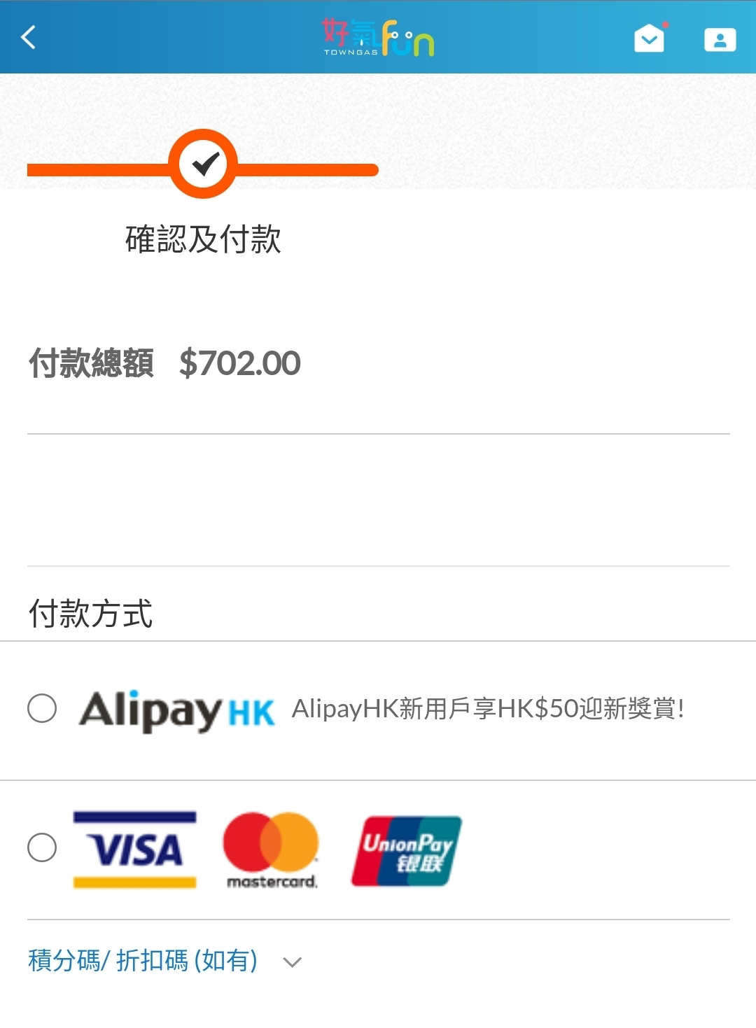 7. 選擇付款方式,完成付款。